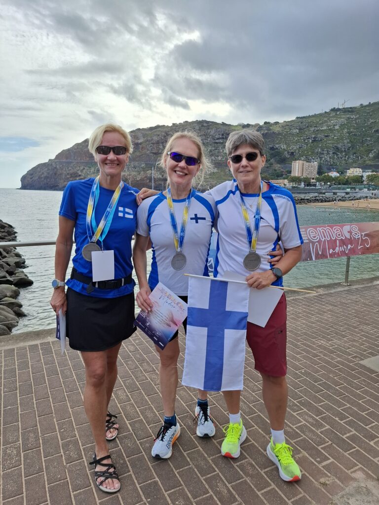 Suomen hopealle sijoittunut 50-vuotiaiden kilpakävelyjoukkue 10 km kisassa vasemmalta Outi Siimes, Marita Harju ja Ursula Koivunen. Kuvan lähetti Marita Harju