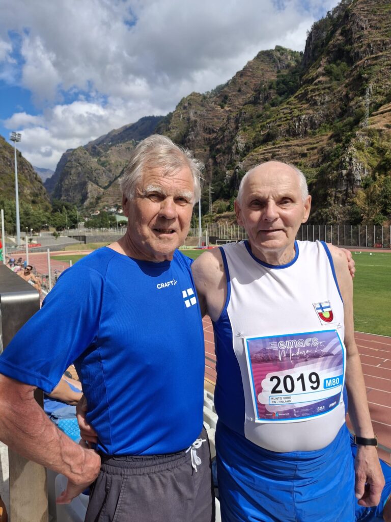 Antti Koskela osallistui 65-vuotiaiden korkeushyppyyn. Kisa oli äärettömän tasainen ja Koskela päätyi jaetulle toiselle sijalle ylitettyään 150. Onneksi olkoon EM-hopeasta! Viisi vuotta nuorempien sarjassa Kari Pohjola kävi myös tasaisen kamppailun missä 150 jäi parhaimmaksi ja päätyen lopulta neljänneksi. Harmittavan lähellä oli mitali. Jarmo Lipasti (M75) on hurjassa kunnossa! EM-Madeirassa tuli jo toinen kultamitali yhden hopean ja yhden pronssin lisäksi. Tällä kertaa Lipastin ylivoima oli näytillä korkeushyppypaikalla.
