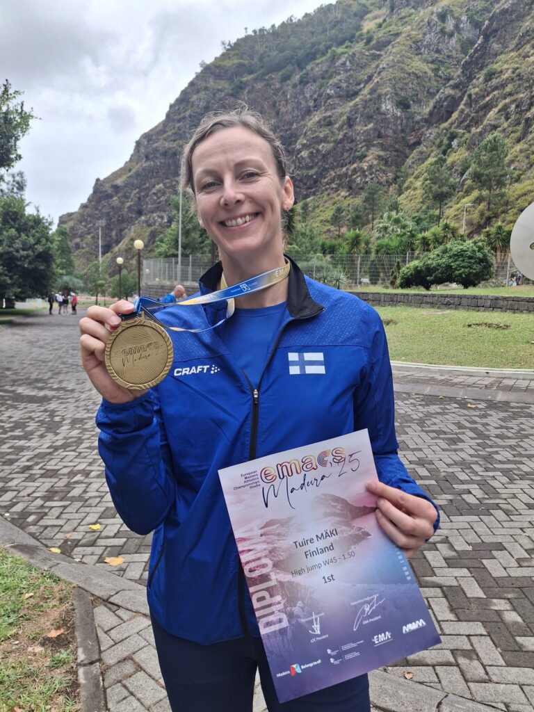 Tuire Mäki (N45) oli erittäin tyytyväinen, sillä ei sitä joka päivä voita korkeushyppykisaa Euroopan mestaruuskisoissa! Hopeaa tuli Helinä Pihlajalle (N80).