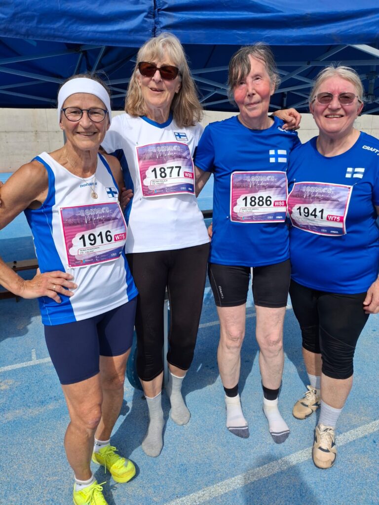 Neljä suomalaista kolmiloikkaajaa Madeirassa. Terhi Kokkonen (N75) EM-pronssia, Helinä Pihlaja (N80) EM-pronssia , Varpu Holmberg (N80) EM-kultaa ja Marja Maksimainen (N75) EM-nelonen. Kuva: Karita Soukko