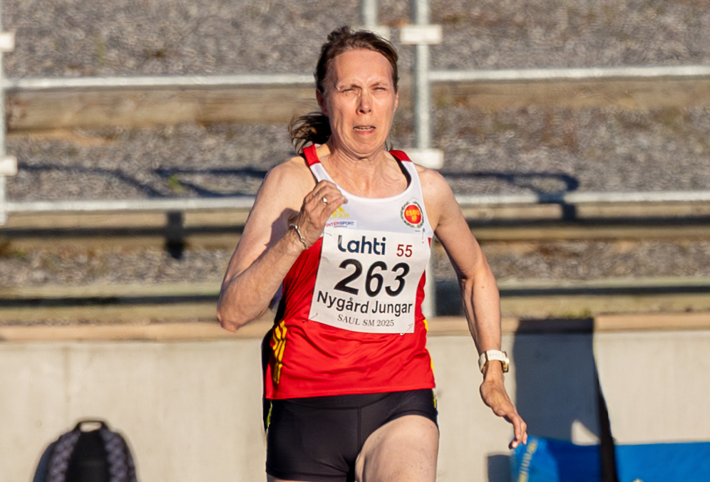 Esbo IF:n Ingela Nygård Jungar juoksi 60-vuotiaiden 60 metrin Suomen ennätyksen Helsingin Liikuntamyllyssä lauantaina. Helsy-halleissa juostu aika 9,12 alittaa kahdella sadasosalla Terhi Kokkosen 2009 juokseman entisen SE:n 9,14.