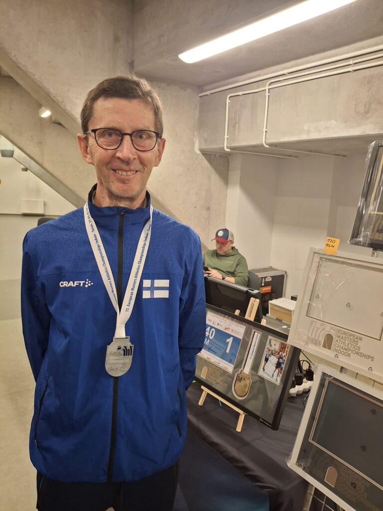 Jukka Kauppila (M65) sanoi, ettei 5 km maantiejuoksusta ole tulossa mitalia, mutta taas pääsi näin käymään, että kaulassa roikkuu hopeamitali. Kuva: Karita Soukko